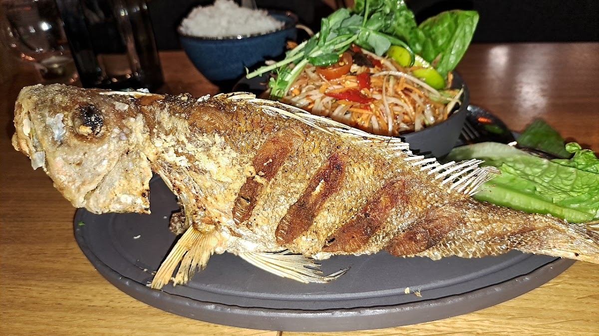 Another highlight on the menu is the Naudanliha (beef dish). Cooked to perfection, it’s an ideal option for anyone who loves tender, flavorful beef, enhanced with the unique seasonings that define Thai cuisine. If you're craving something fresh and crispy, the ปลาทอดส้มตํา (fried fish with papaya salad) is the perfect choice. It combines the crunchy texture of the fish with the zing of the papaya salad, creating a delightful balance of flavors.